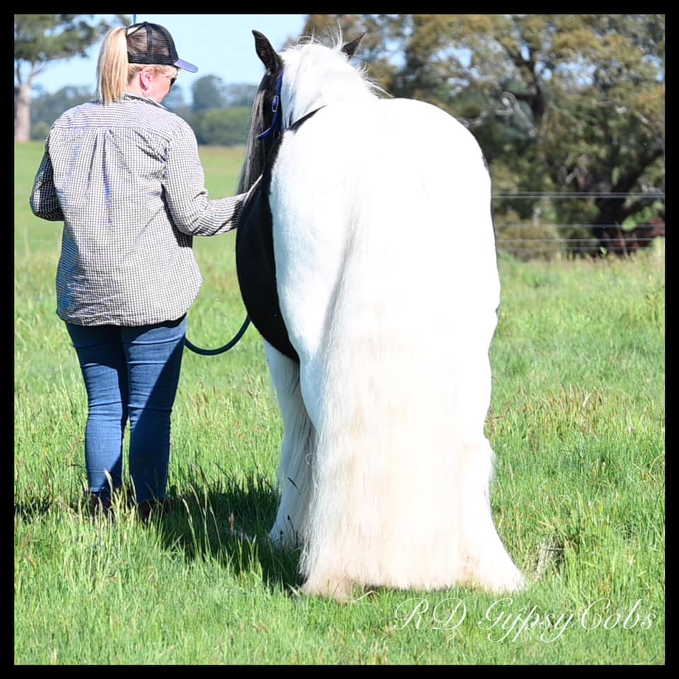 Squeeze a small amount of the Dr Show detangler into the palm of your hand and then proceed to massage the product thoroughly from the top to the tip of the tail using a raking action with your fingers spread.